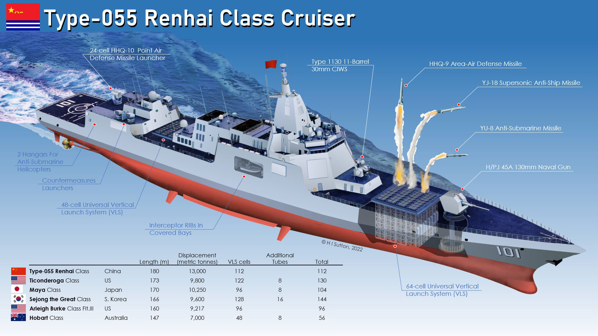 این شناور با وزنی حدود ۱۲ تا ۱۳ هزار تُن و طولی نزدیک به ۱۸۰ متر، در رده بزرگترین کشتیهای جنگی سطحی جهان پس از ناوهای هواپیمابر قرار میگیرد.